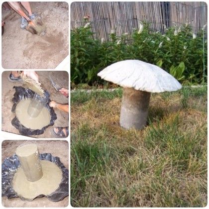 Для виготовлення гриба знадобляться старий гумовий м’яч або миска, вистелена поліетиленом (для шапочки), пластикова пляшка (для ніжки), металевий прутик (для з’єднання шапочки і ніжки). М’яч треба розрізати навпіл, покласти половину у відро з піском (для фіксації об’єму), рівномірно втиснути, заповнити цементним розчином, вставити посередині прутик. Із пляшки зрізати дно, одягнути горлечко на прутик і злегка втопити у цемент. Залити розчином пляшку. Через кілька днів зняти пляшку і м’яч. Ще через кілька днів розфарбувати.