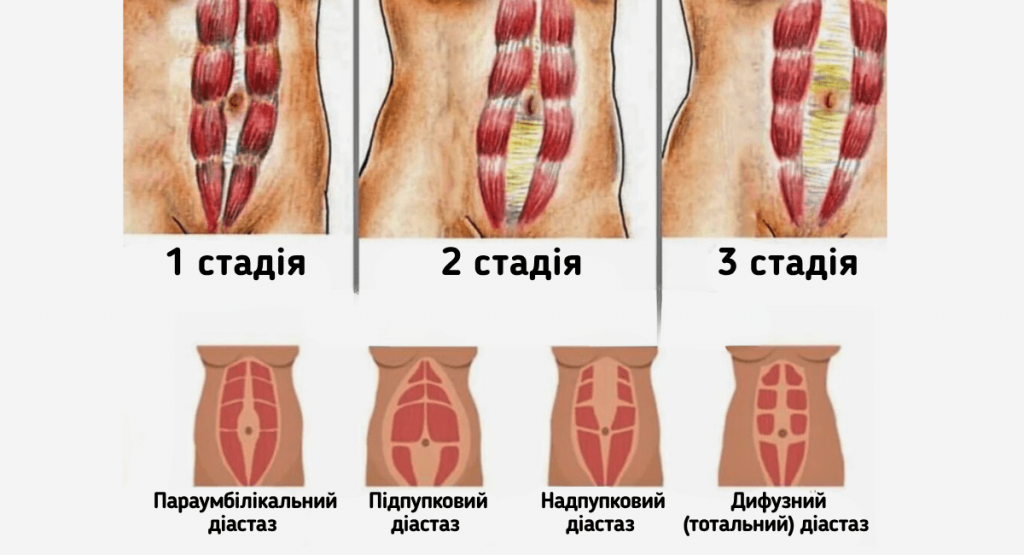 — Виділяють гіпотонічний діастаз (розходження плюс загальна слабкість м’язів преса, втрата стабілізації центру), гіпертонічний (спазмовані бокові м’язи при «проваленому» центрі, підвищений внутрішньочеревний тиск) і функціональний (розходження проявляється тільки під час зусиль — наприклад, при підйомі з ліжка).