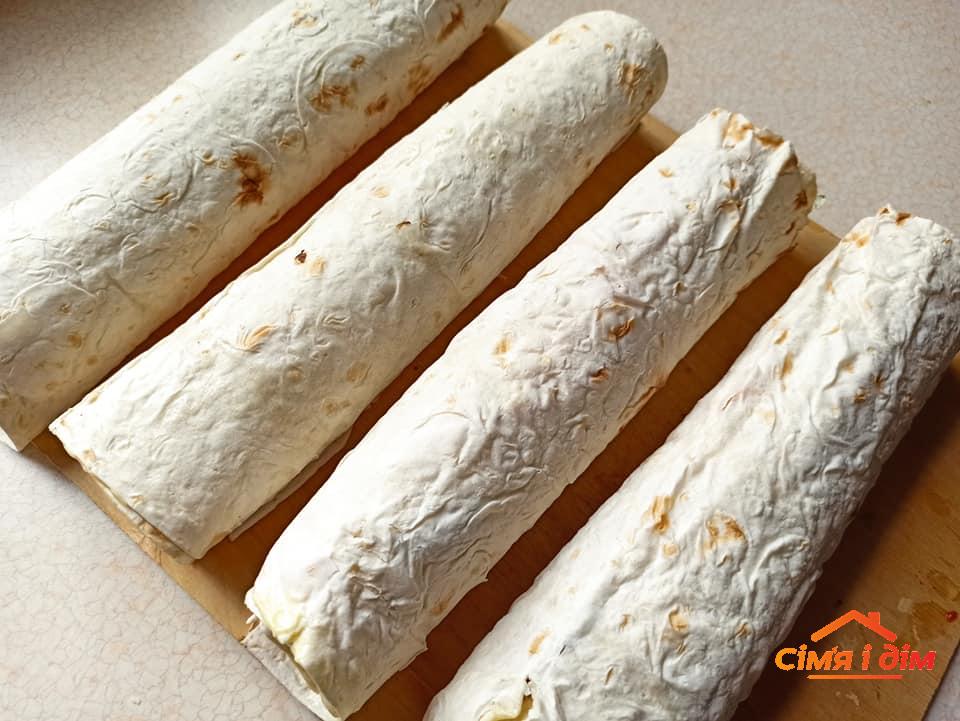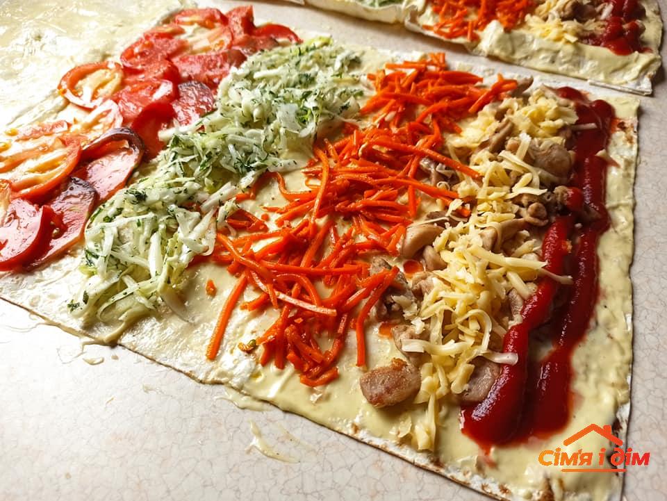 М’ясо порізати смужками, посмажити до готовності, посолити, додати спеції. Капусту тонко нашаткувати, посолити, віджати руками, заправити олією, можна додати 0,5 ч. ложки цукру, чорний перець, кріп. Помідори порізати тонесенькими скибочками. Лаваші розгорнути (я розкладаю на чистому столі), всю поверхню тонко змастити майонезом з часником. Всю начинку розділити на 4 частини. Викладати смужками, як на фото: м’ясо (полити кетчупом, посипати тертим сиром; якщо є, сюди ж покласти обсмажені печериці), морква по-корейськи, салат з капусти, скибчки помідорів. Край лаваша має залишитися без начинки, але він має бути змащений майонезом. Згорнути рулетом, починаючи від краю з м’ясом. Краї я не загортаю: начинка не випадає! Покласти на решітку, посмажити над вугіллям (порада: зачекайте, доки вугілля ледь вихолоне, бо лаваш швидко горить).