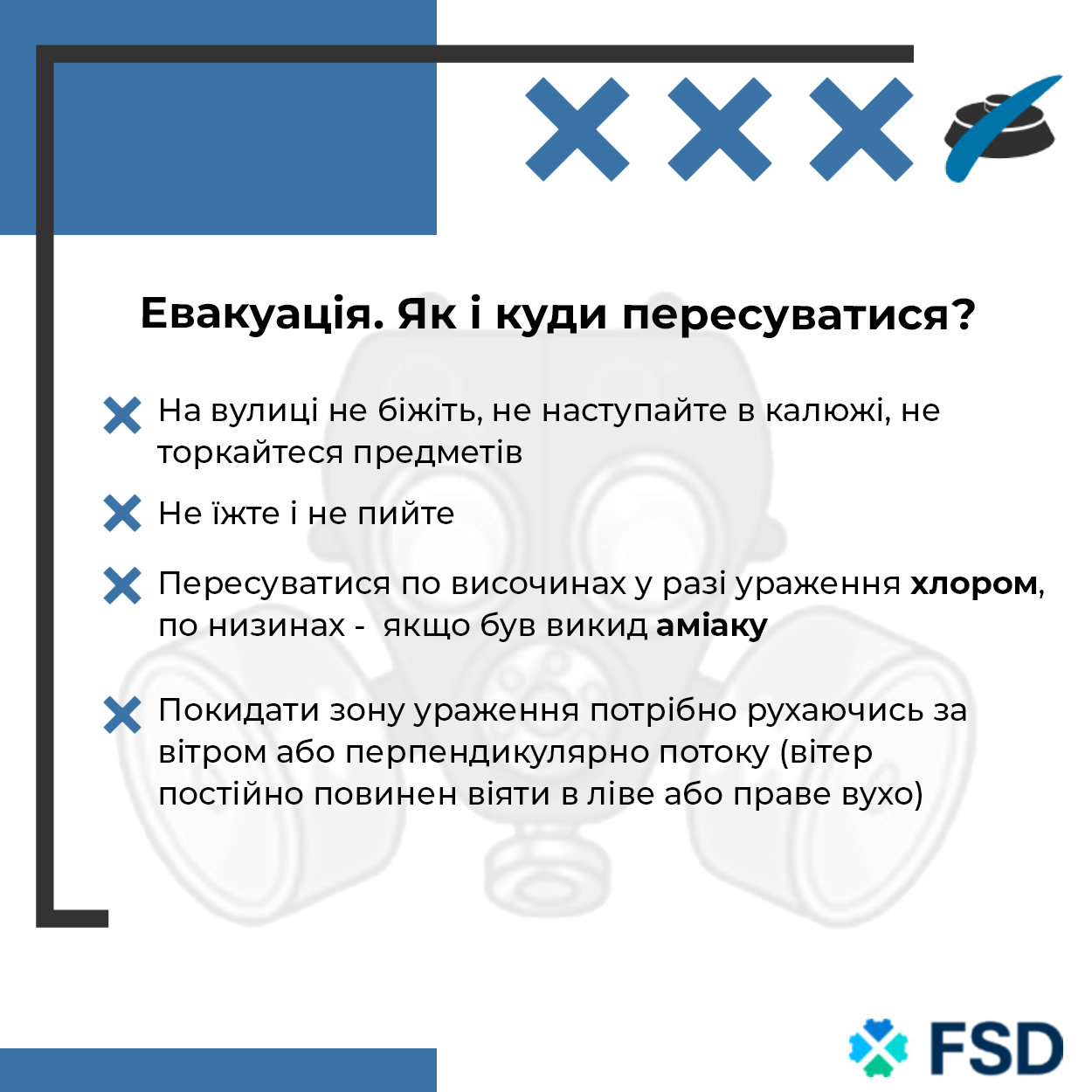 - Пересуватися по височинах у разі ураження хлором, по низинах – якщо був викид аміаку.