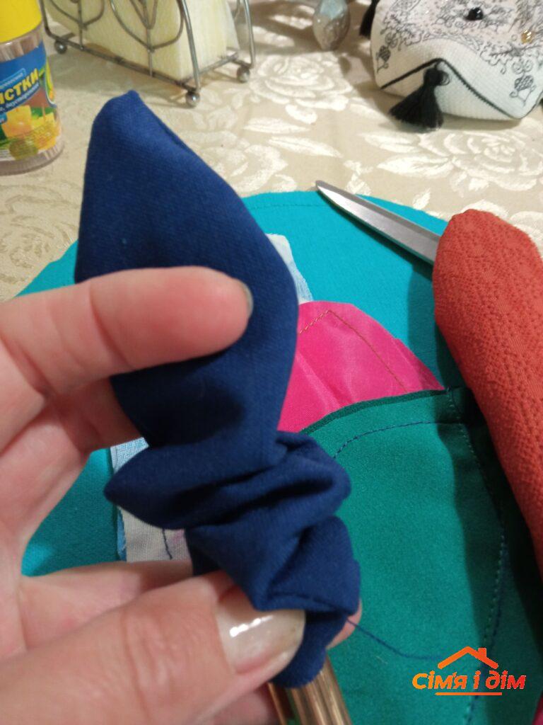 Крок 2. За мацаки може слугувати будь-що: відрізки різнокольорових стрічок, в`язані мереживні смужки, навіть декоративні шнури, зав`язані вузликами на кінцях. Я мацаки не полінувалася пошити кожен з іншої тканини. Для цього довільної (на ваш смак) довжини і шириною приблизно 15:4=3,75 см (чотири штуки з кожного боку майбутнього восьминога) викроюємо (не забувайте додавати по 1 см зусібіч на шви) вісім пар деталей.