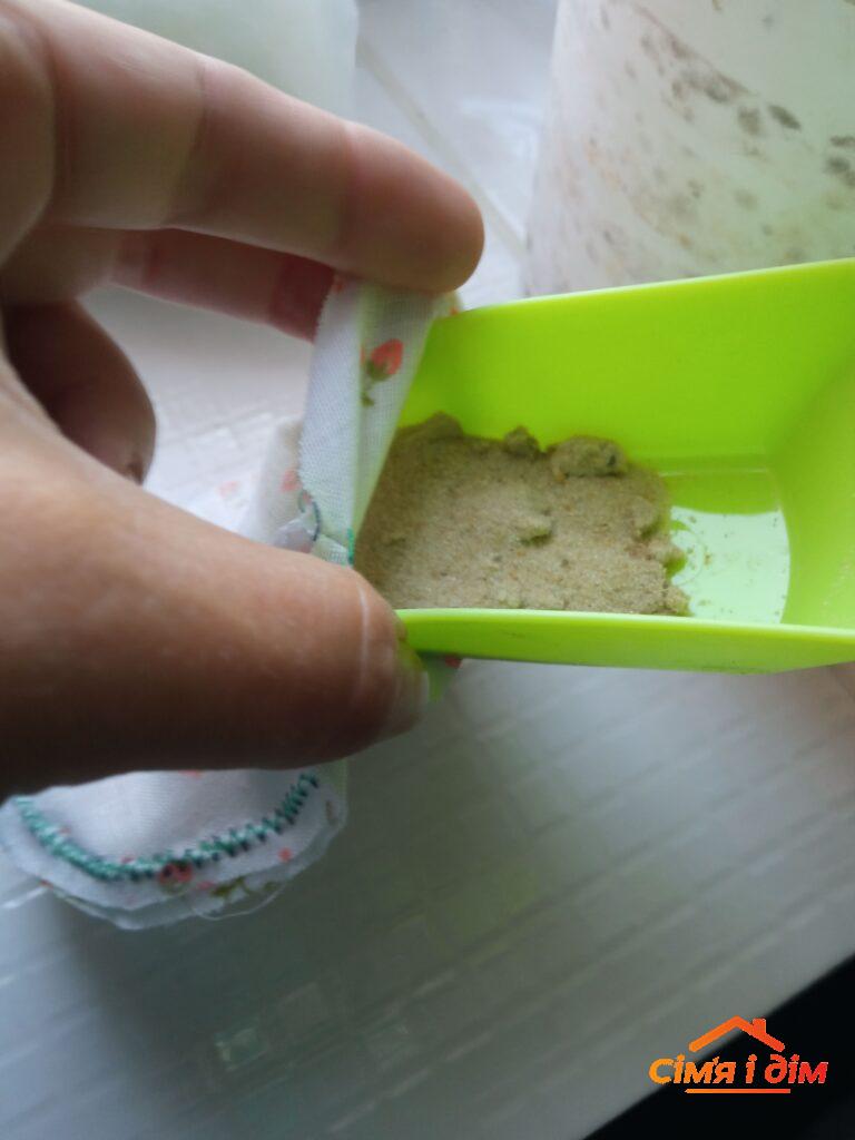 Крок 6. Повністю висохлий пісок через залишений незашитим отвір всипаємо у наш круглий мішечок, можна використати лійку чи просто скрутити ріжок із паперу. Зашиваємо наглухо. Пісок має сидіти там, як сало в посилці, і ніяк не проявляти себе назовні.