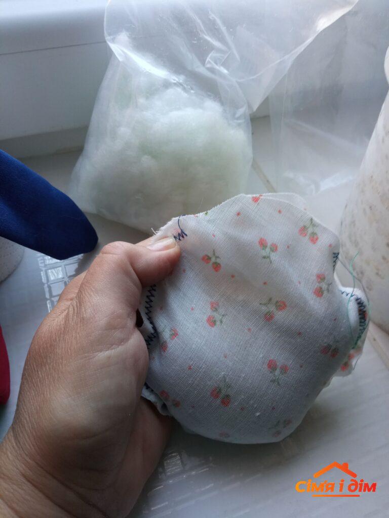Крок 7. Якщо ви вирішили наповнити іграшку горохом – наповнюйте. Нам – трохи складніше. Наповнюємо досить щільно холофайбером, рівномірно розподіляючи його по всьому об`єму. Через той же отвір вкладаємо наш круглий мішечок із піском. Справилися? Тепер зашиваємо з зовнішньої сторони, вручну, дрібними стібками залишену ділянку. Усе. Готово.