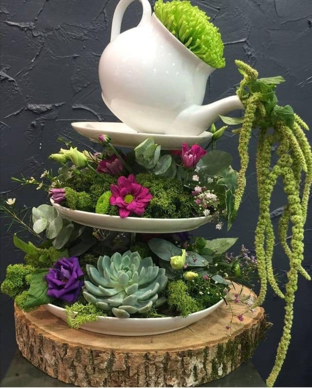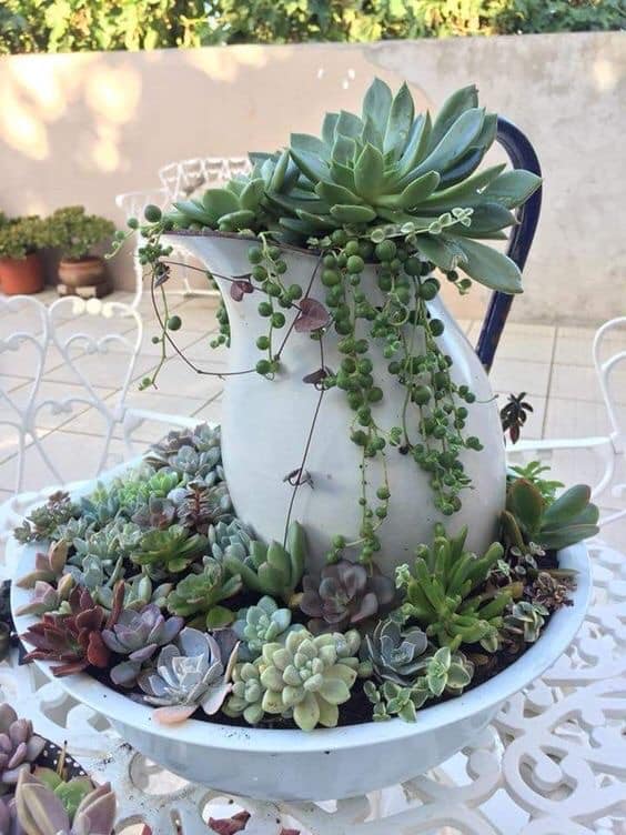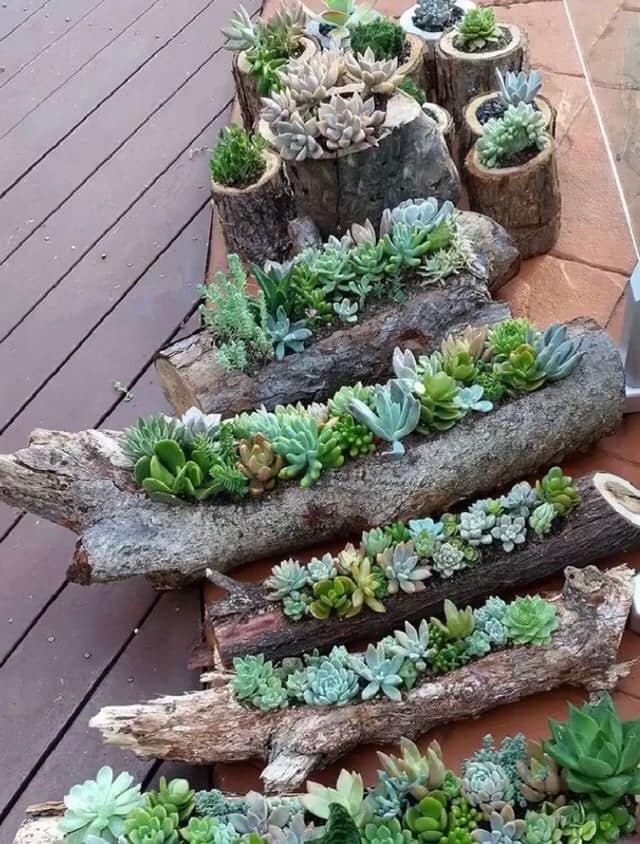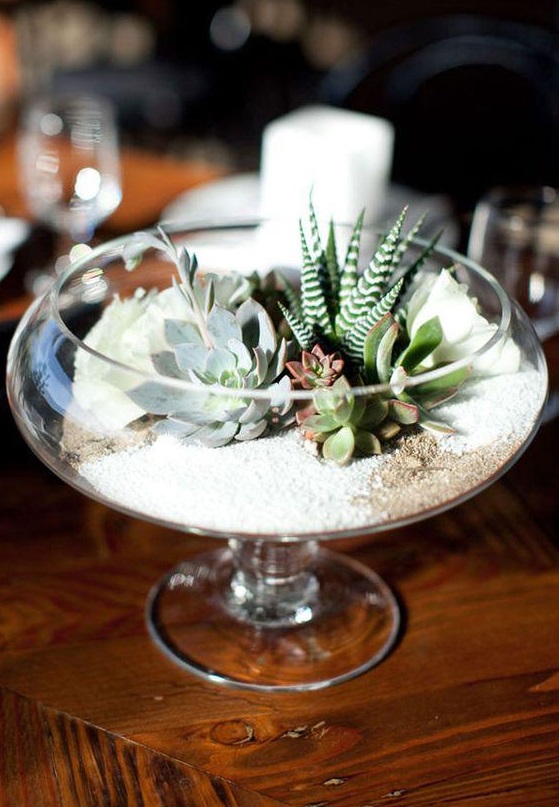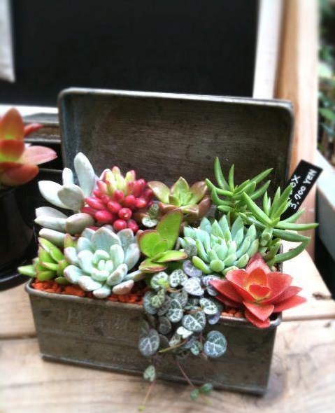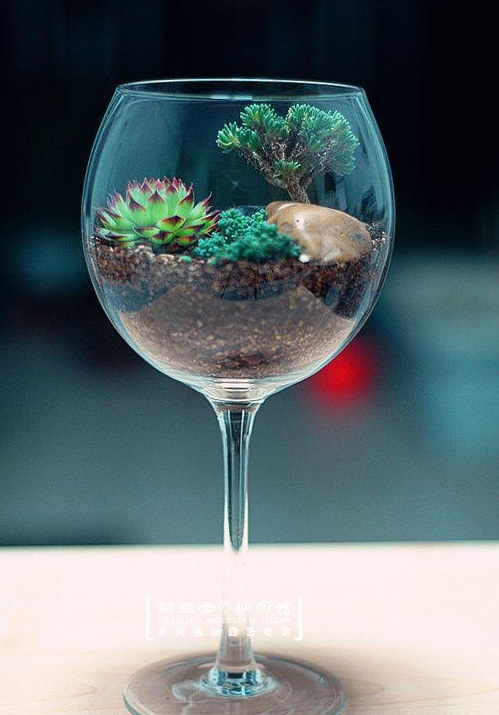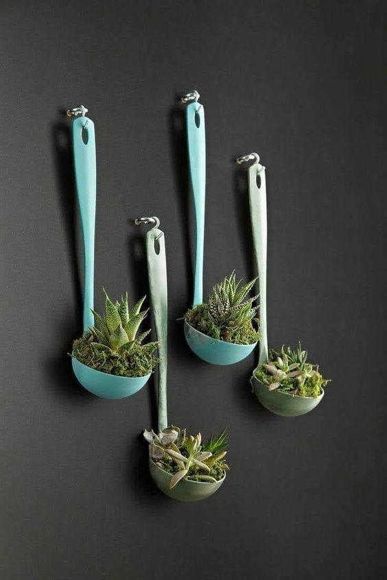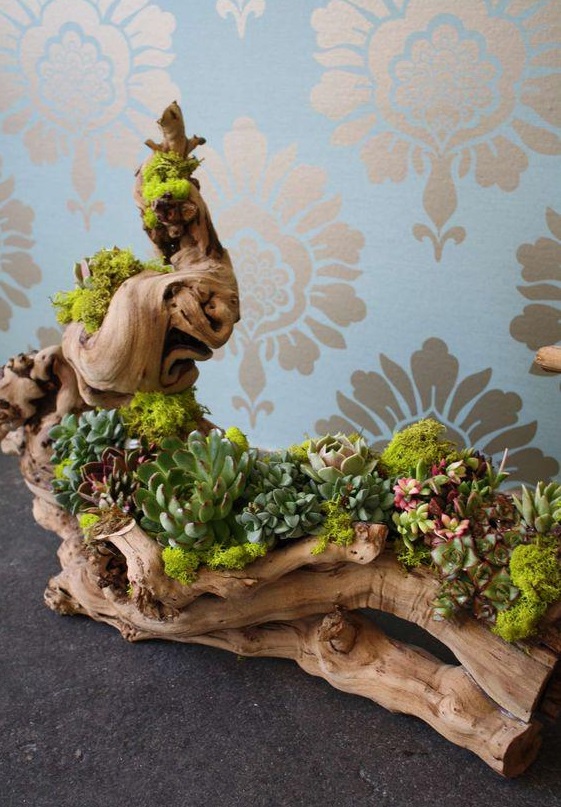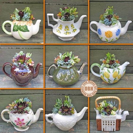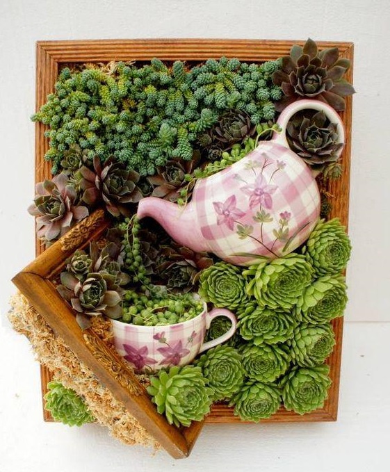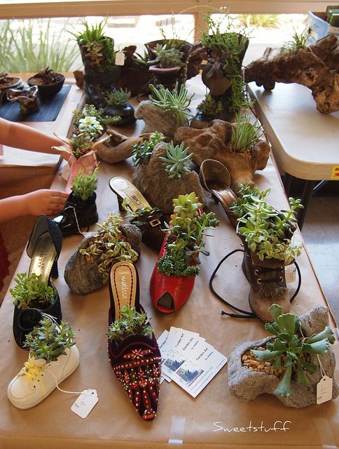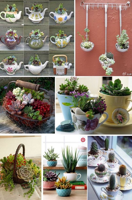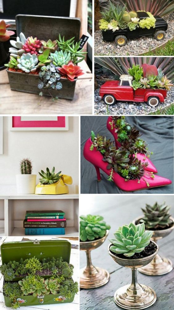 У ролі горщиків для сукулентів використовують скляні флораріуми, прозорі кулі, келихи, чашки, скриньки, багатоярусні тарілки, кору дерев, мушлі, взуття та практично будь-що, куди можна помістити ґрунт для невеликого корінця рослини.