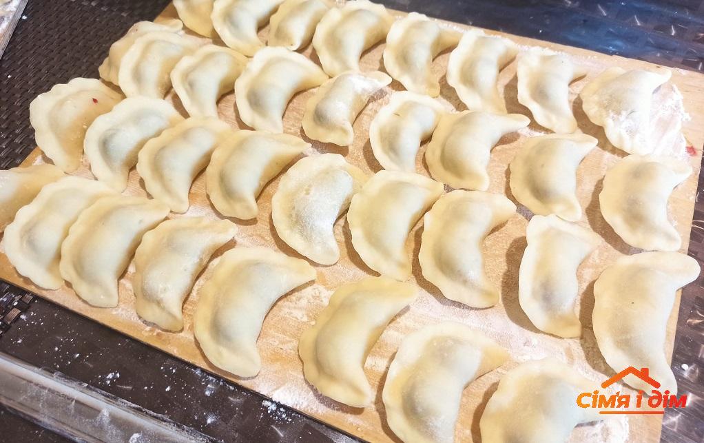 Із цієї порції тіста виходить дві дошки вареників (дві таких, як на фото), достатньо щоб досита наїстися сім’ї із 4-6 осіб.