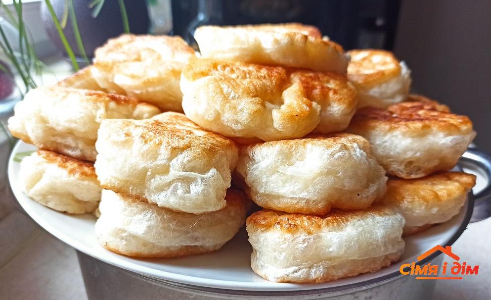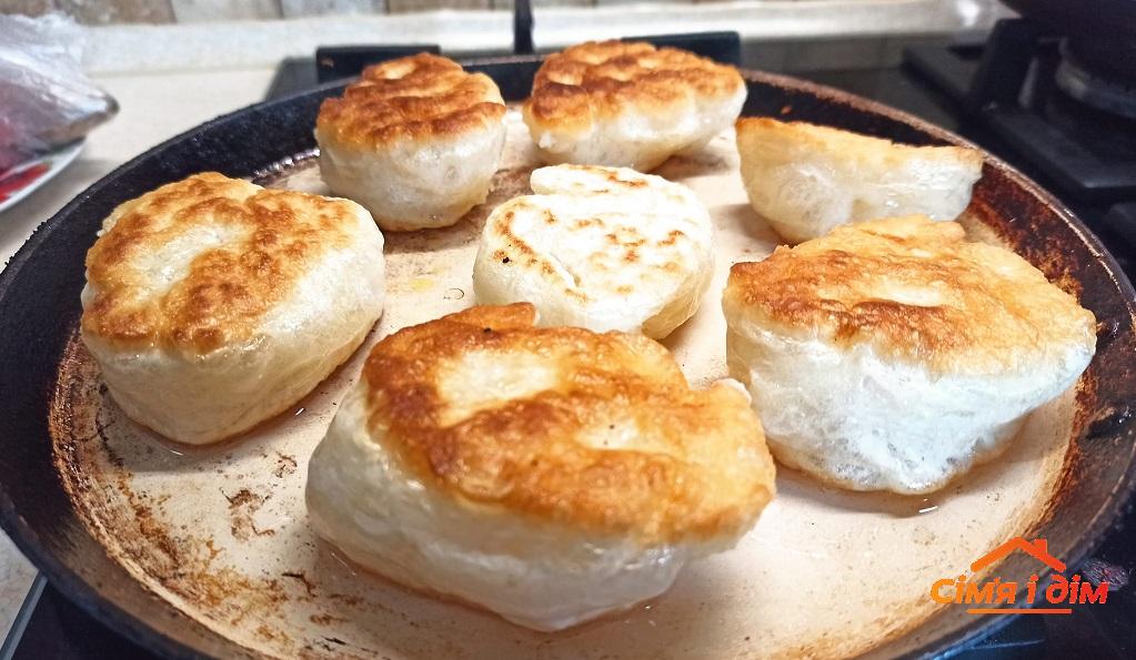 У теплу воду (можна замінити всю воду або частину на молоко або сироватку) додати сіль та цукор, дріжджі, перемішати, додати борошно, перемішати до однорідності. Накрити рушником, поставити у тепле місце на 20 хв (можна поставити у миску з теплою водою, тоді тісто зійде швидше), перемішати тісто і залишити ще на 40 хв. Тісто має збільшитися у 3 рази. Його більше не перемішувати! Набирати ложкою біля країв миски і смажити з двох боків на олії.