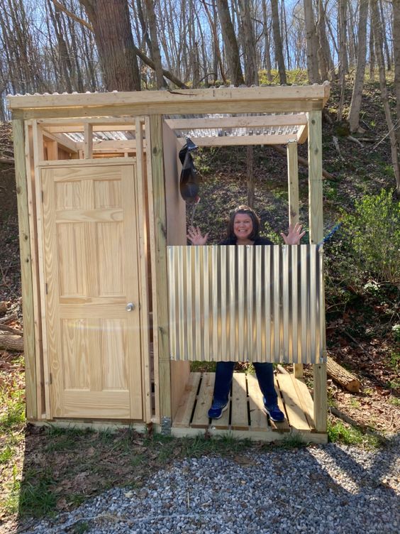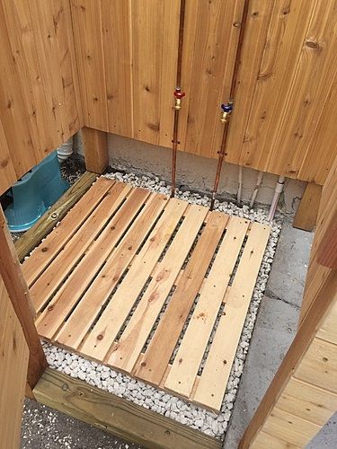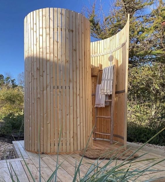 - Деревина. Оброблене або водостійке дерево є класичним вибором для зовнішніх душових, оскільки воно не тільки красиво виглядає, але й стійке до гниття та вологи.