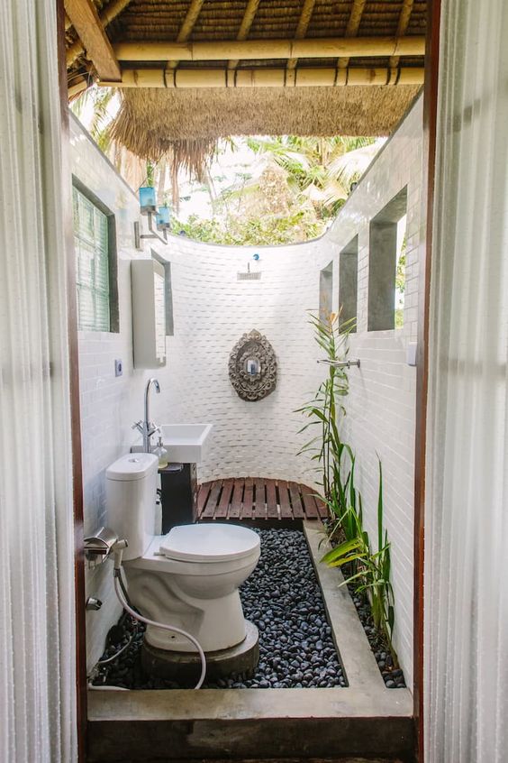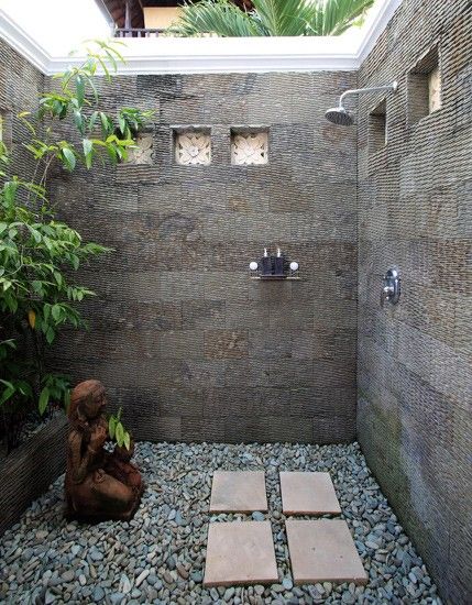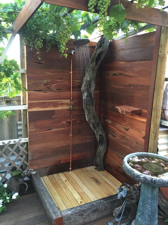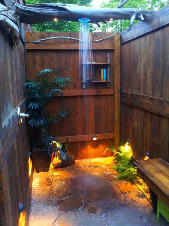 - Душ “просто неба”. Для більш природного відчуття можна зробити душ без критого даху, обмежившись лише парканом або живоплотом для приватності.