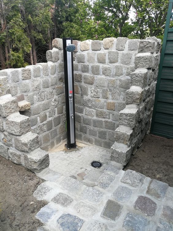- Камінь та плитка. Для підлоги та стін можна використовувати природний камінь або не ковзку плитку, що не лише забезпечить безпеку, але й додасть вашому літньому душу естетичної привабливості.