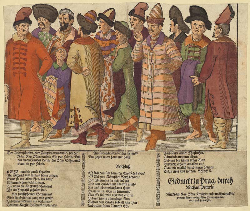 На гравюрі зображено посольство царя Івана Грозного, відправлене 1576 року до Відня до імператора Священної Римської імперії Максиміліана II, прийняте ним на імперському сеймі у Регенсбурзі.