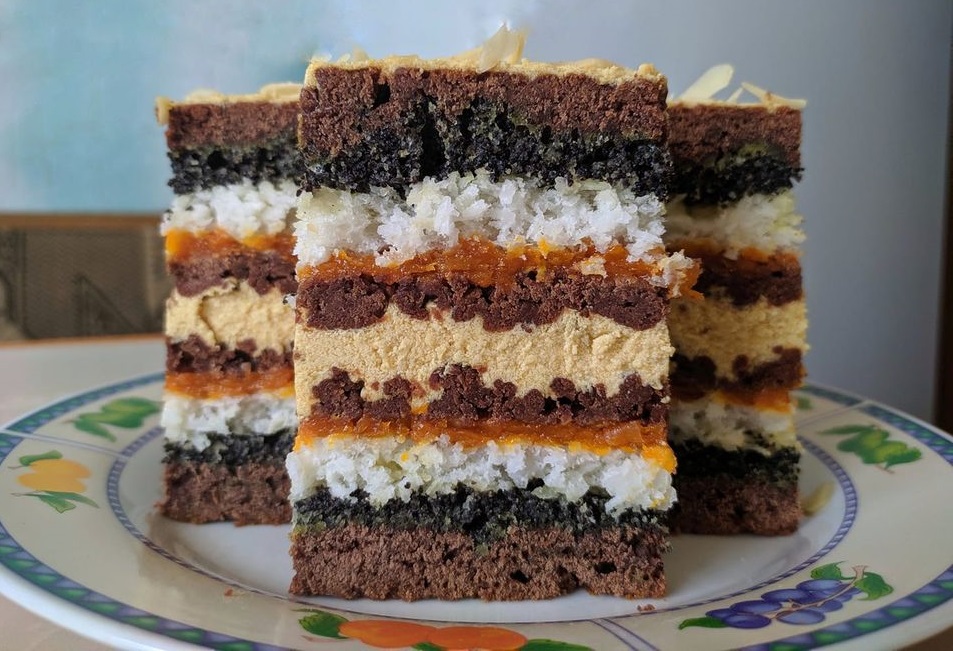 Скласти корж: у форму, вистелену пергаментом, на крупній тертці натерти частину тіста, викласти макову масу, кокосову, тоді – пюре з кураги. Зверху дотерти залишок тіста. Випікати 30 хв при температурі 180 C. Дати охолонути. Випікати другий корж. Я відразу робила все на 2 порції, випікала у великій формі та розрізала на 2 коржі.