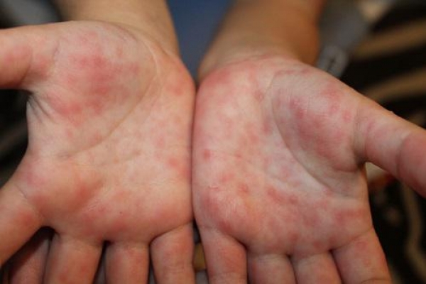• Висипання у вигляді пухирців на долонях, ступнях та у роті (так званий синдром «рука-нога-рот»).