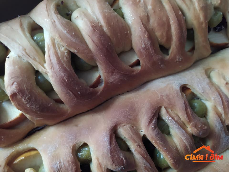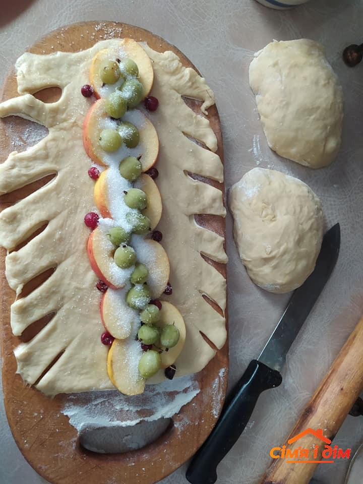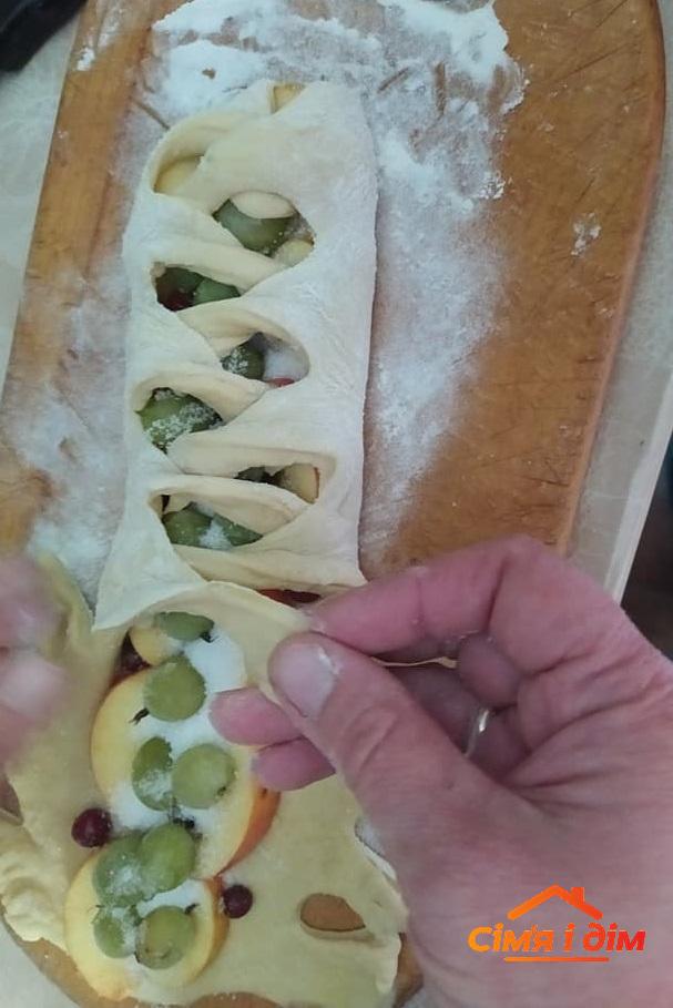 Розкотити тісто у формі прямокутника, зробити по обидва боки надрізи. Посередині викласти начинку, посипати цукром. По черзі накривати смужками надрізаного тіста. Дати 15 хв підрости і випікати при 170 ОС до готовності. Начинку можна змінювати. Перед випіканням можна змастити збитим яйцем. Родзинка цього пирога у способі формування.