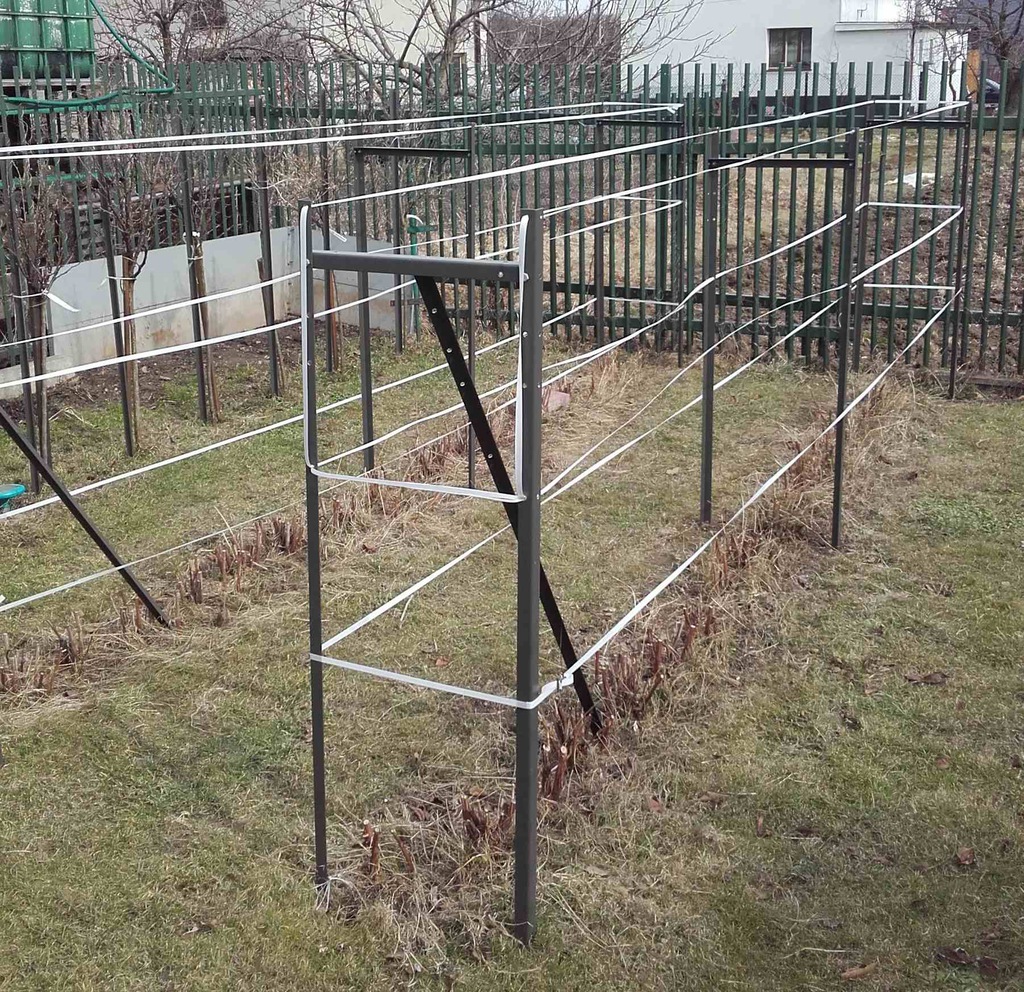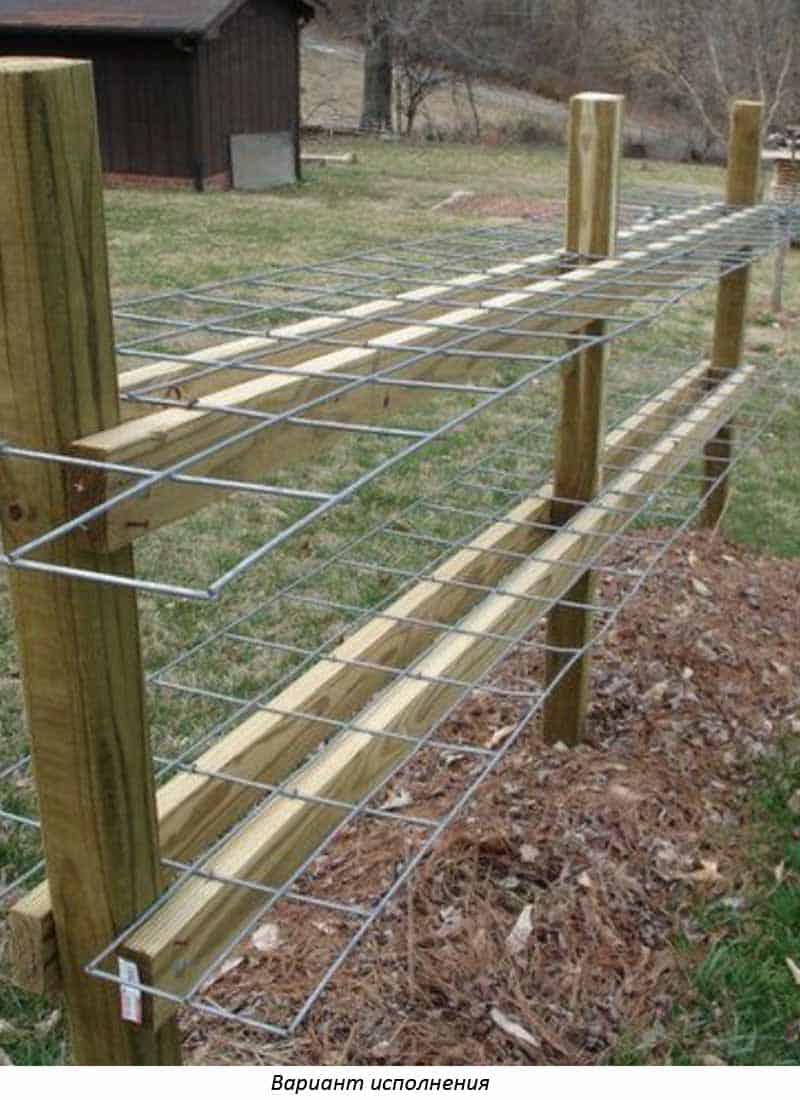 Варіант №4: Стовпчики та сітка. Цей варіант включає стовпчики, виготовлені з дерева або металу, та сітку, яку можна прив’язати дротом. Такі конструкції зручні, але пагони можуть плутатися в сітці, що ускладнює їх підв’язування пагонів.