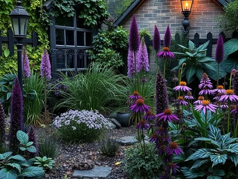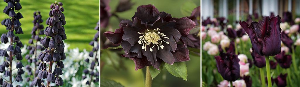 Поєднати темне (чорне / пурпурне) листя з «димними» рослинами (сизі трави, сріблясті листки) для глибини й ефекту.