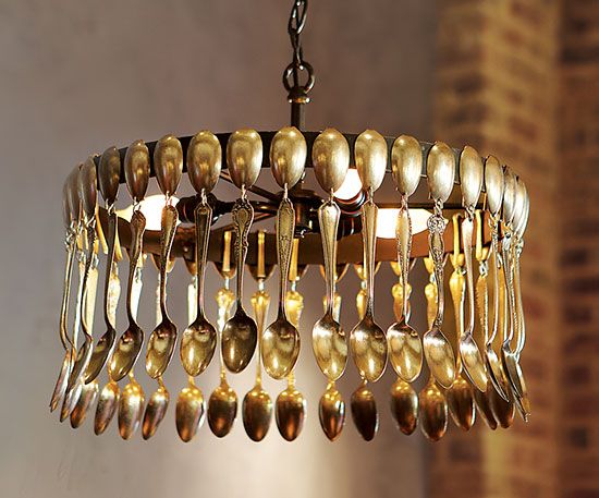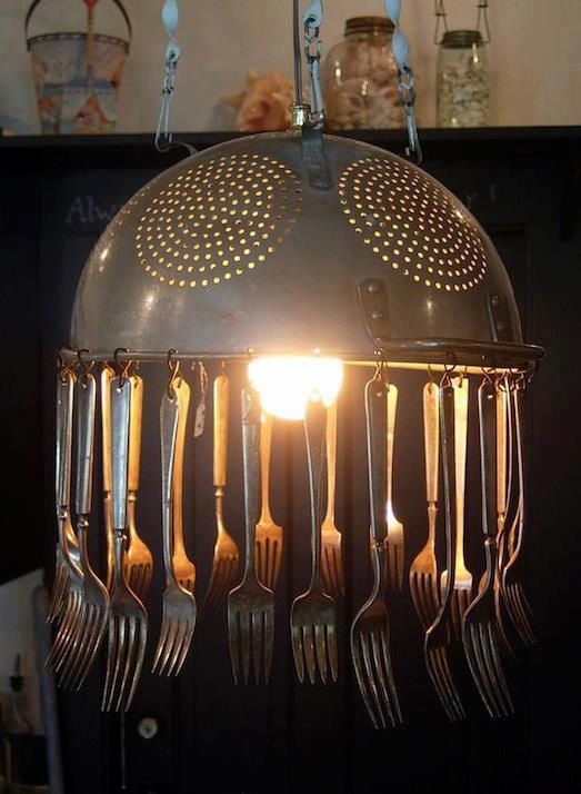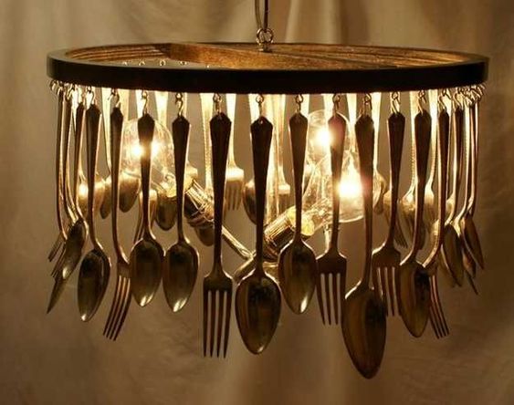 Дуже ефектний вигляд мають абажури на світильник, виготовлені із підвішених ложок та вилок.