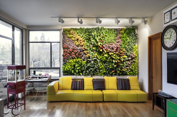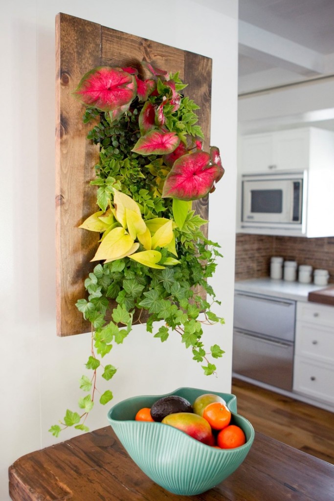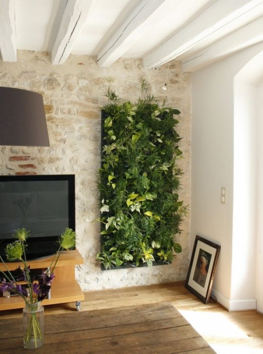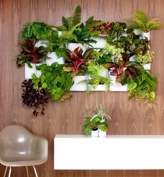 Вертикальний сад можна зробити у приміщенні з простих кімнатних рослин. Це може бути фітостіна або фітокартина. Для її створення рослини можна розташувати: