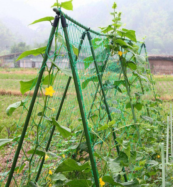 • Опорами можуть бути металеві труби або дерев’яні кілки. Їхня висота залежить від сорту огірків.