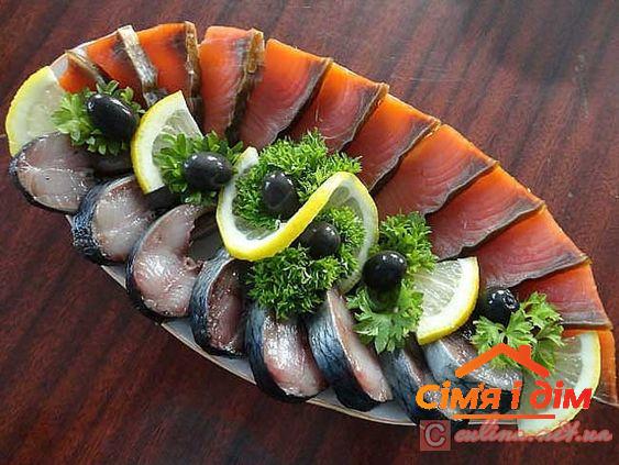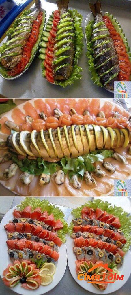Рибна тарілка завжди виглядає вишукано та дорого. У її основі — червона риба (лосось, форель), ікра, креветки та вугор. Для створення гармонійної композиції рибу нарізають тонкими скибочками та викладають у вигляді троянд або хвиль. Ікру можна подати у маленьких тарталетках або на тонких скибках огірка.