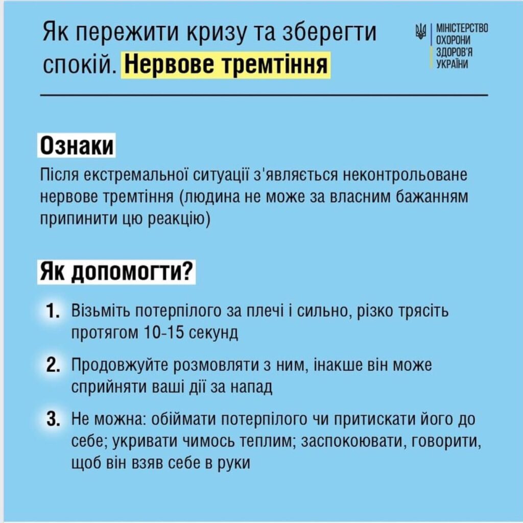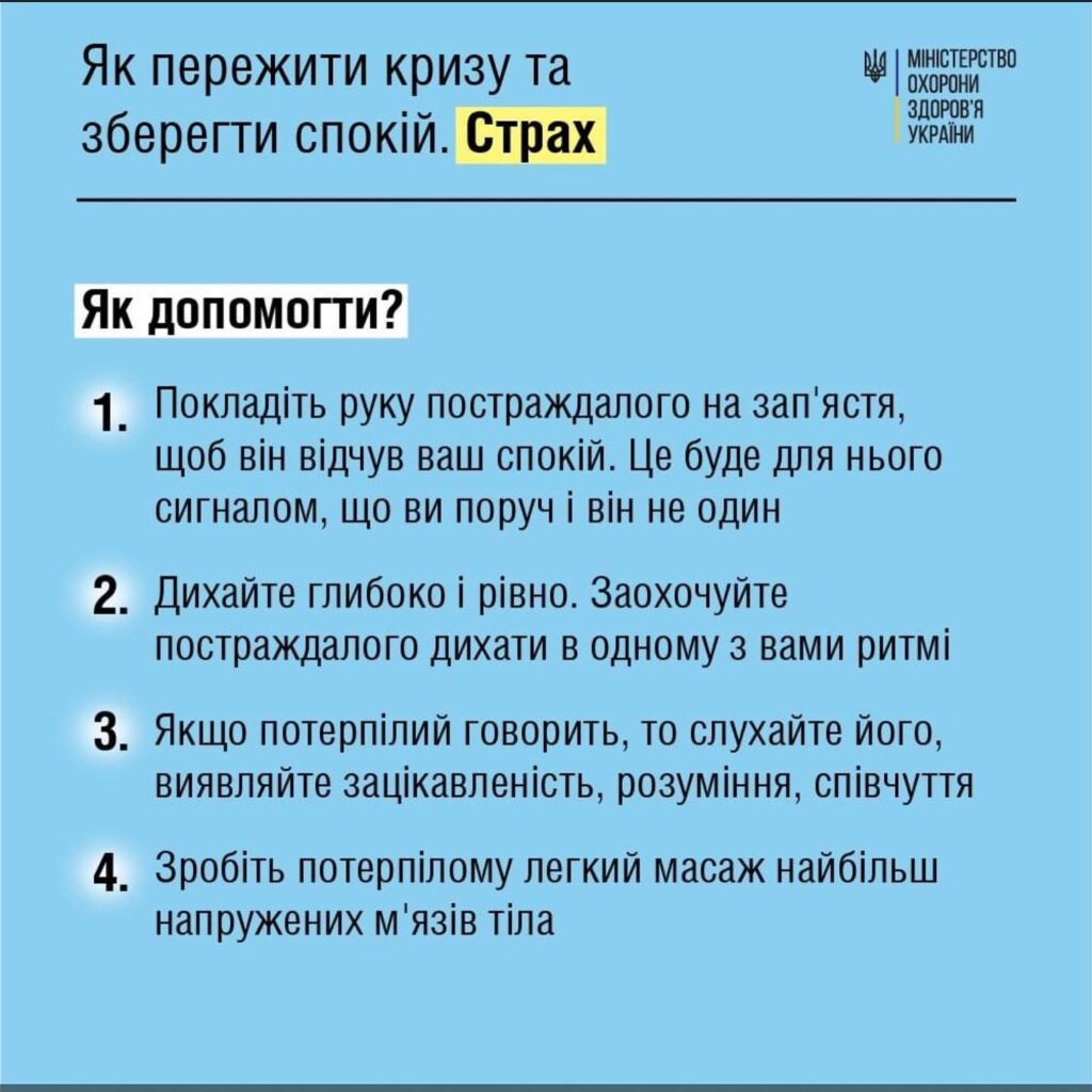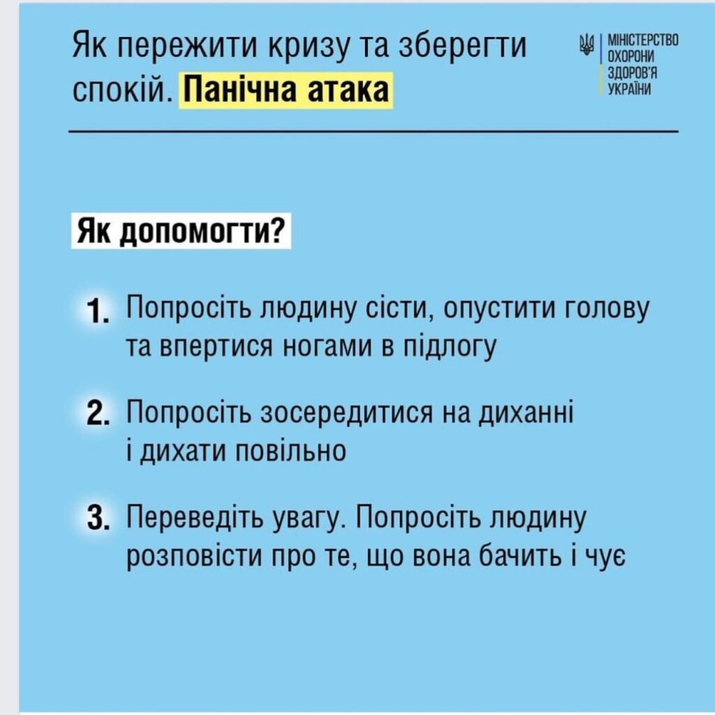 МОЗ України зібрало базові рекомендації, як допомогти людині, яка перебуває в постійному страху, плаче і не може зупинитися, як вийти із ступора, агресії або істерики, як позбутися панічної атаки та тремтіння.