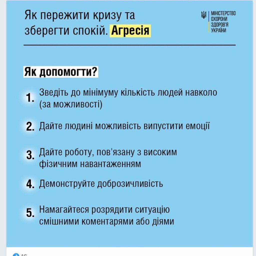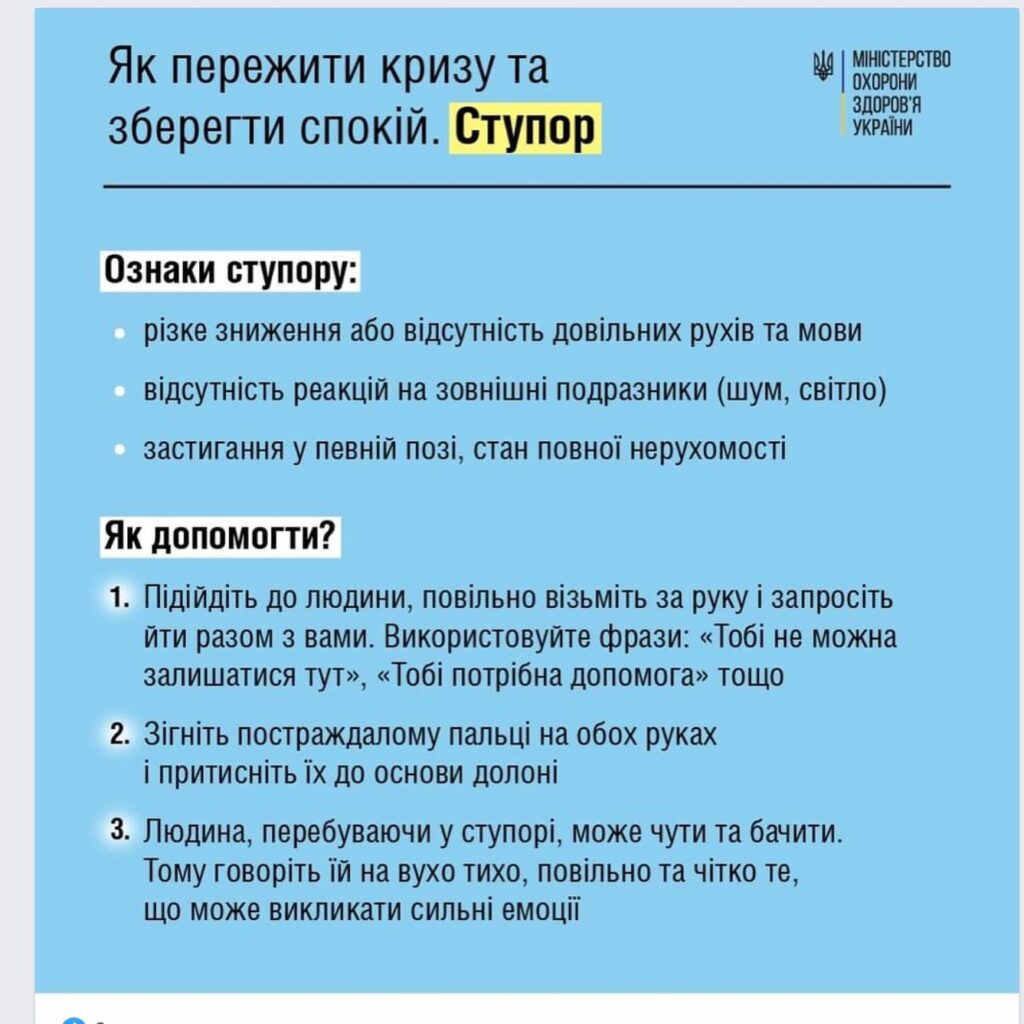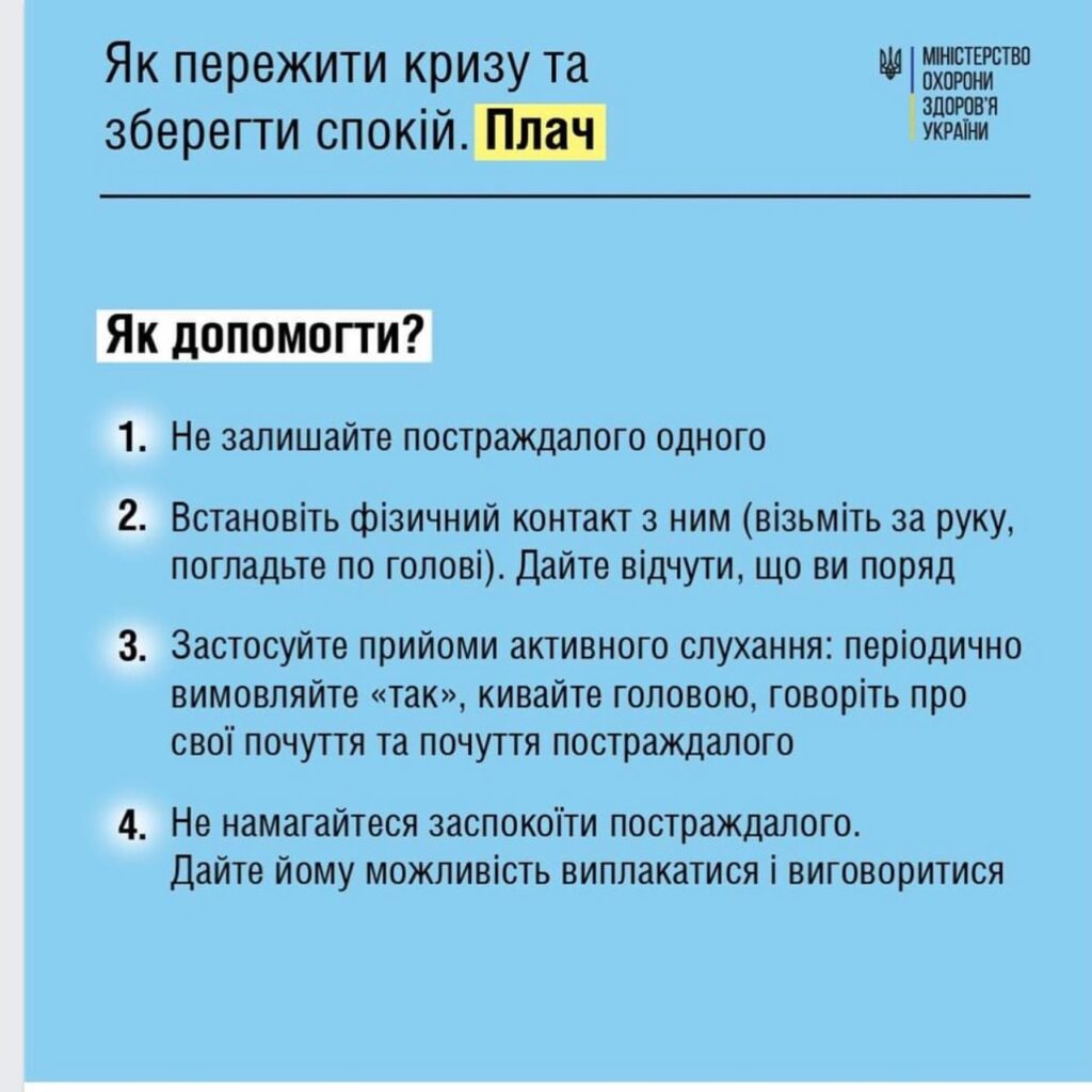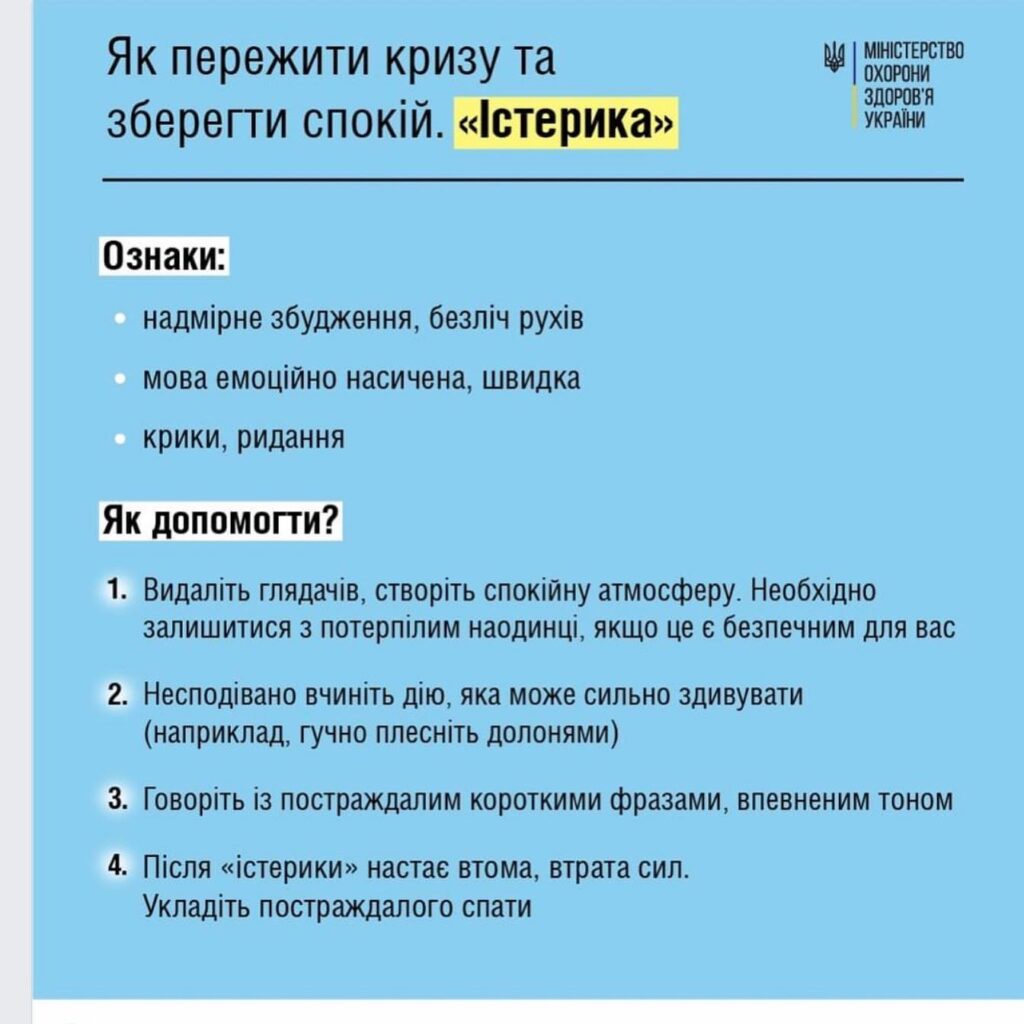 МОЗ України зібрало базові рекомендації, як допомогти людині, яка перебуває в постійному страху, плаче і не може зупинитися, як вийти із ступора, агресії або істерики, як позбутися панічної атаки та тремтіння.