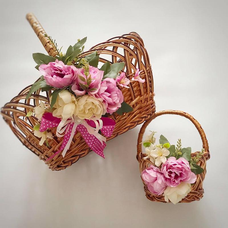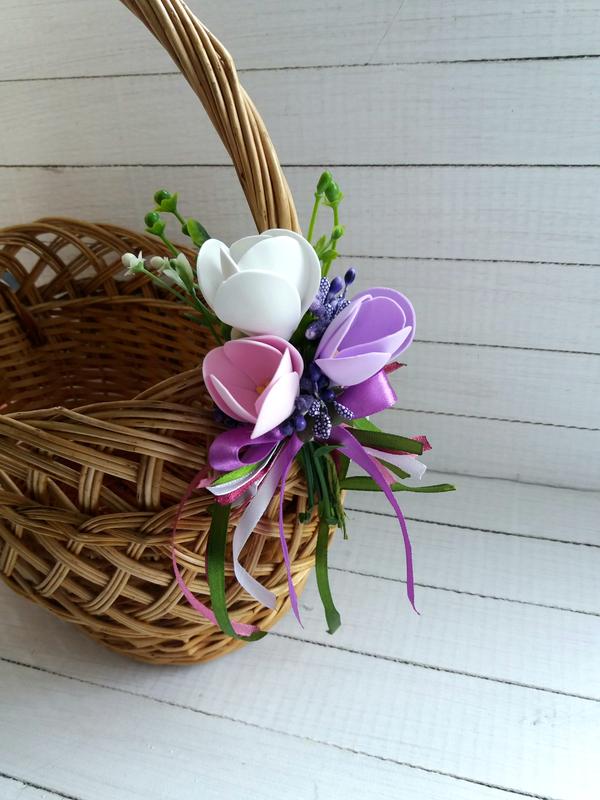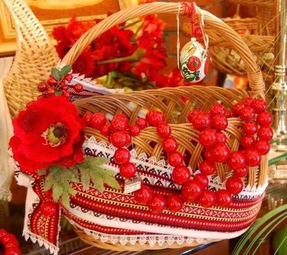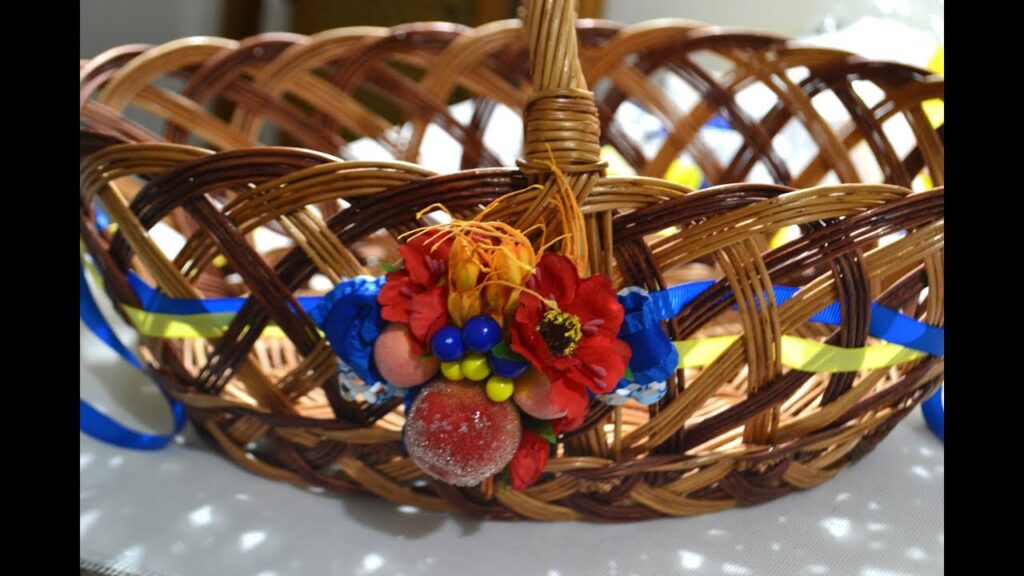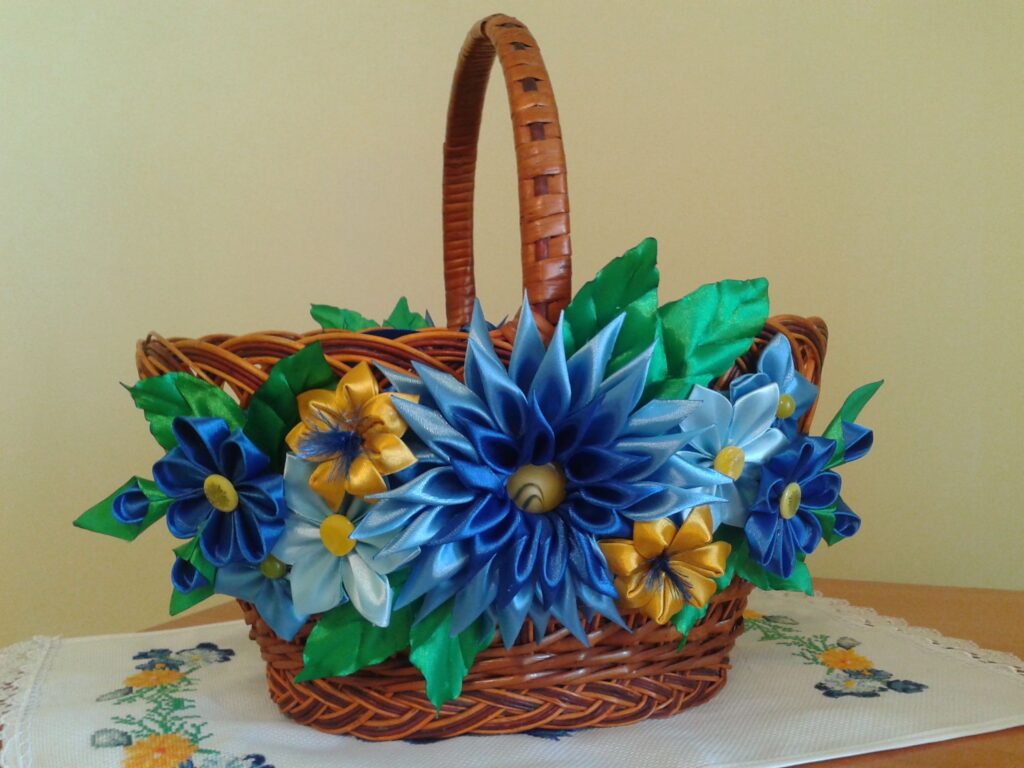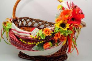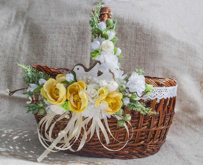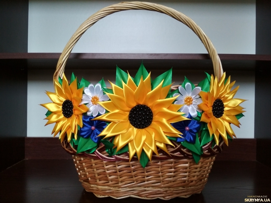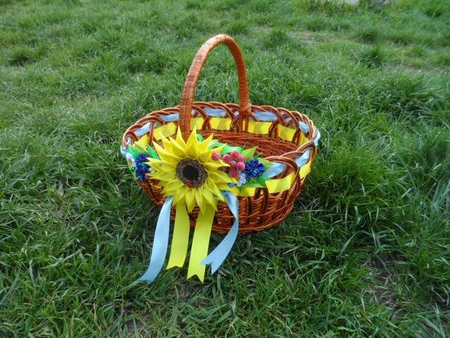 - Для прикраси можна обрати традиційні українські квіти, як-то соняхи, ромашки, маки, волошки. Такий декор чіпляють зазвичай з одного боку кошика, розміщують вертикально на ручку.