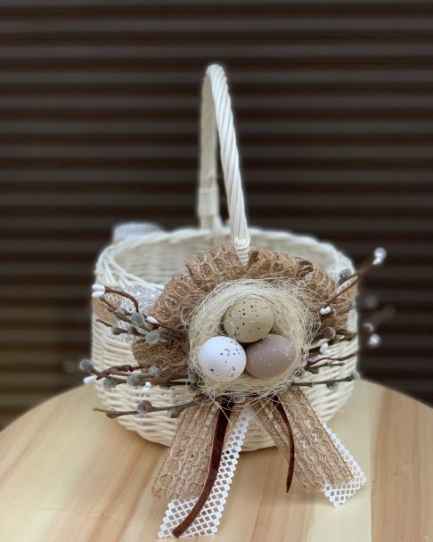 - Вузьким рушничком, задрапірувавши його, можна прикрасити кошик збоку.