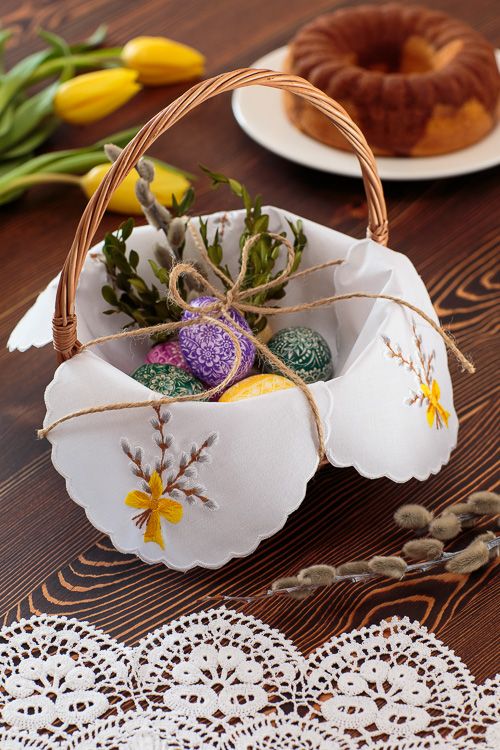 Також обов’язково кладуть вишиваний рушничок. Традиційно господиня вишиває його заздалегідь власноруч. Нитки – символ життя. А схеми на вишивці мають таємний код, який господиня закладає на щастя і здоров’я своїй родині. Таким рушничком вистилають дно кошика і накривають його зверху, аби до кінця богослужіння на їжу не потрапив пил.