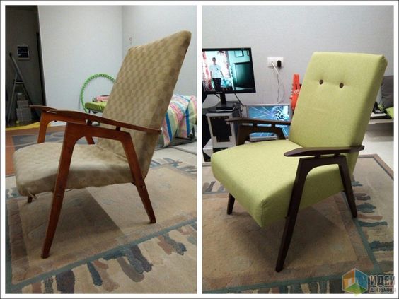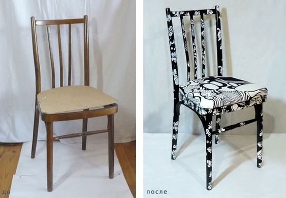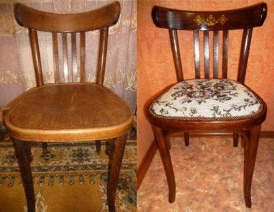 Щоб оновити старий дерев’яний стілець із м’яким сидінням і спинкою, потрібно зняти текстильні елементи, почистити всю поверхню наждачним папером. Тричі покрити лаком, щоразу зачищаючи наждачкою після повного висихання. За розміром основи для сидіння і спинки вирізати шматок поролону, синтепону і тканину (два останніх – із запасом) і прикріпити меблевим степлером. За допомогою цвяхів основу прикріпити на місце.
