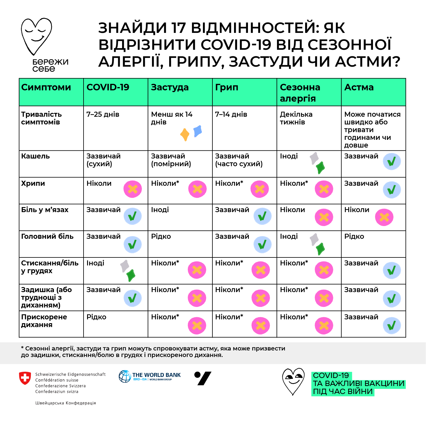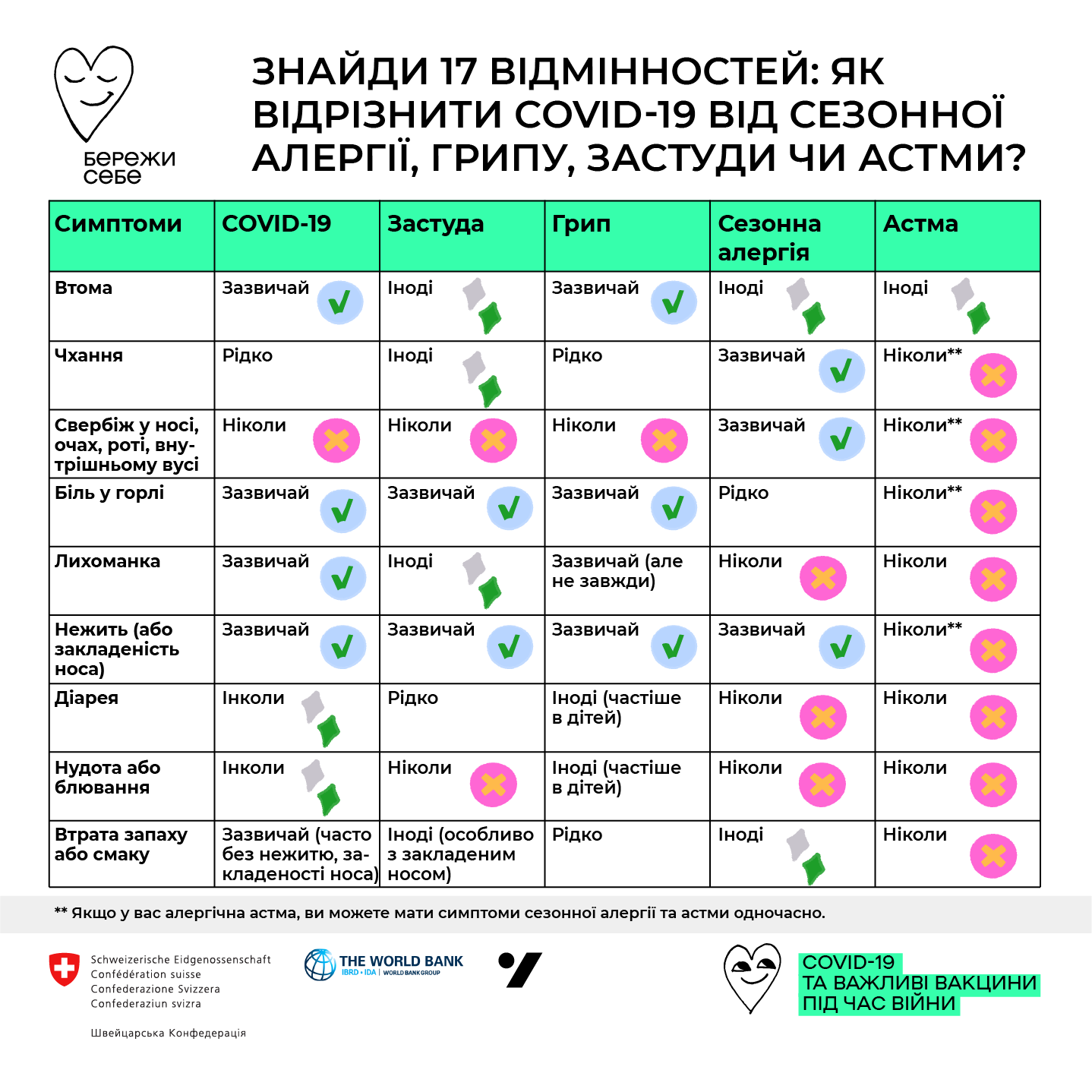 Якщо ви вважаєте, що у вас можуть бути ознаки COVID-19 чи інших захворювань, зверніться до свого лікаря/ки. Пам’ятайте, що дотримання профілактичних заходів допоможе вам зберегти здоров’я.