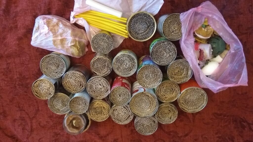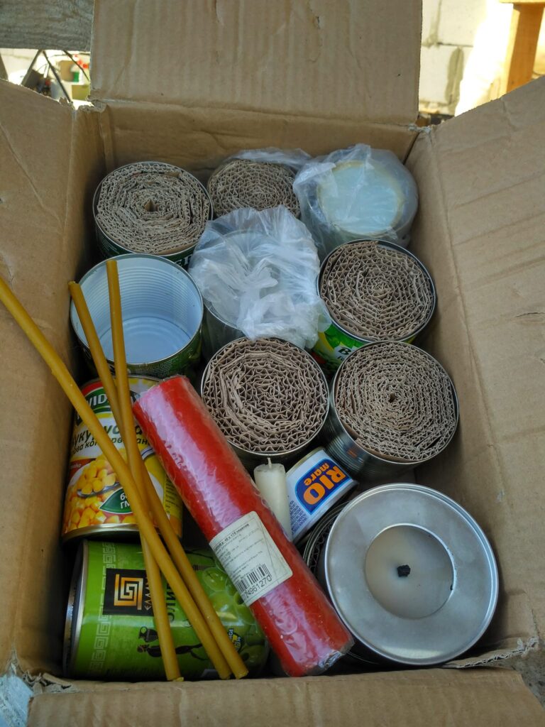 - Пошукати вдома і пробігтися по сусідах назбирати консервних бляшанок (не пивних банок, а саме з-під консервів, але не вище, ніж банка горошку), свічок (воскових, парафінових, нових, старих, великих, маленьких, будь-яких) і коробок з гофрованого картону (з великими сотами).