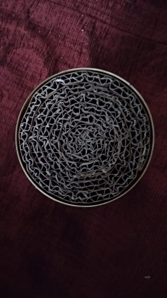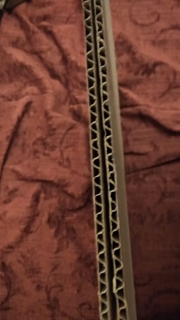 - Гострим ножем нарізати картон впоперек гофри на смужки шириною трохи менше, ніж висота бляшанки (на 3-5 мм).