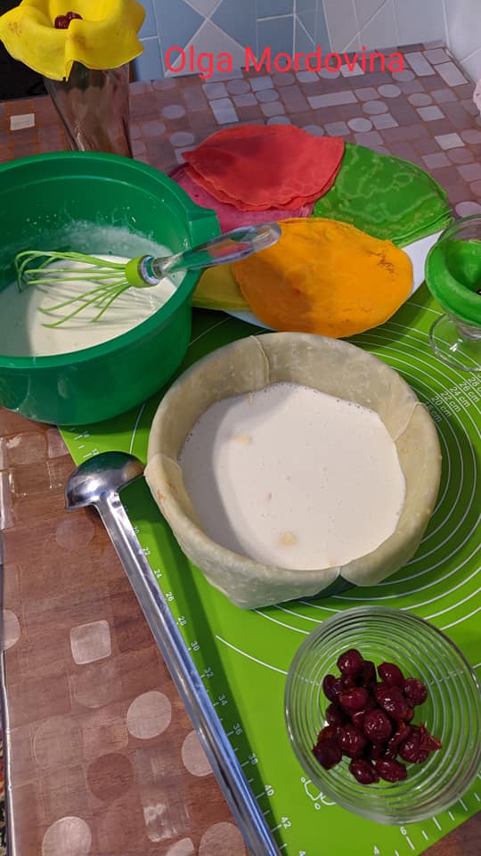Желе замочити у 200 г води. Желатин замочити у 170 г води. Сметану розмішати з цукром, ваніліном (не збивати!!!) та додати розтоплений желатин. Перемішати і зачекати, щоб трішки постояла маса. Вилити 1/3 маси на дно вистеленої млинцями форми (дивіться на фото). Далі брати кольорові млинці, класти по 3-5 вишень та по трішки маси та викладати щільненько у форму. Має залишитися 1/3 маси. До неї додати розтоплене желе та гарно все перемішати. Залити зверху всі кольорові млинці та закрити тортик. Поставити на 5-6 год у холодильник та прикрасити за бажанням.